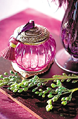 强烈推荐的紫色单品:各种不同紫色的布料、毛巾、蜡烛、香水瓶。