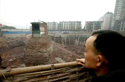 吴蘋:我哪里想得到。我说你依法的话,我争取第一个走,因为我为生活奔波,上有老,下有小。我在拆迁的第一天,就把所有的产权证原件都拿过去了,他们不光是看你的证件,还要向房管局、国土局调档,什么都是按照他们来的。一开始开发商就巴不得拿他们那么一点点可怜的钱,而且又很低廉。重庆的房地产价格大约也是四千左右,而且我那个是营业门面,商业铺面,二楼才给三千多,这样我肯定不能接受,就选择还房,很简单,你按房子还给我就行了嘛。你是开发商,而且是几家合伙的,都是那些人,乱七八糟的凑合起来的股份,利用要赚大钱,你还给我不就行了吗,他说太小不还,我说我这个两百多平米的,你不还吗?