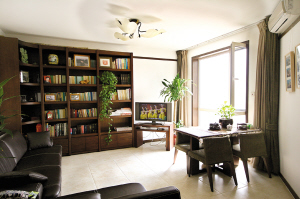 这个为父母设置的一居室虽小但因为巧妙的设计和水准颇高的装修,显得很有品质。宽大的落地窗、时尚的家具、欧系简洁的吊灯、绿色的盆栽……一切都搭配得很和谐,感觉十分舒服。