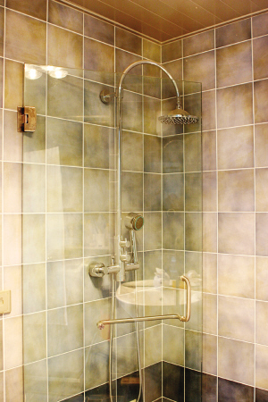 得意之一:卫生间里灵活的玻璃门。淋浴时,该门打开与墙壁垂直的位置,将淋浴处和坐便器隔开,实现干湿分离,而平时该门又可以把淋浴区关起来,这使得3.68平方米的卫生间变得开阔许多。这个创意为她赢得了众亲友的赞叹。