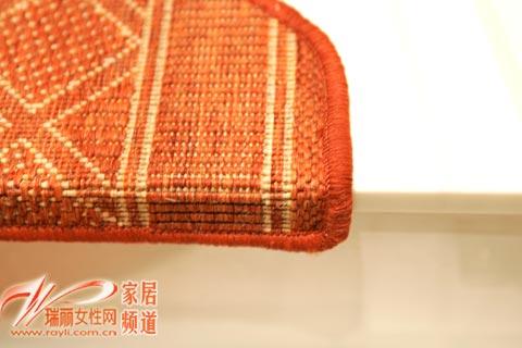 3、把楼梯踏毯放在楼梯踏板确定好的安装位置,用手固定住踏毯的前方,撕去PVC龙骨部位的胶带,然后粘贴在楼梯踏板上,用橡皮锤或用手压紧胶带与梯面接触的部位;