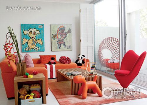 红色跟橘色作为主调并不是很容易把握的,因为大面积此类颜色的使用容易使人感到烦躁,而这间客厅的搭配却恰到好处。墙壁摒弃了花色的壁纸,保留纯白的底色,只挂了两幅充满稚拙童趣的画作,并以简洁明快的天蓝色打破视野中红色占据的僵局。地板也做了简单处理,只铺一块浅淡的扎染效果的地毯,绝不喧宾夺主。