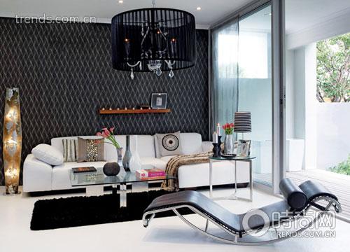 墙壁大面积使用黑底白纹的图案,给地板留出足够简洁的空间。沙发上方做出的原木架将发散的目光重新聚集,照片摆在一侧,圆扁的小蜡烛悄悄亮起,让气氛一下活跃起来。水晶吊灯线条优美,外面笼罩了一层黑色竖纹装饰,与沙发前纯黑的地毯遥遥相望,而躺椅完美的弧度在提供给主人充足的休息之余,也配合着前两者成为屋内最为深暗的色彩之一。横排的白色沙发显露出十足的贵族气息,高高竖在一侧的地灯也相应地做出漂亮的大花图案,亮灯时花朵若隐若现,朦胧之美呼之欲出。