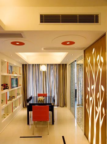 装饰众多,却始终有它存在的理由客厅与餐厅是一个连续的大空间,延续门厅黑、红、白三色相间的设计元素,每个区域的装饰都考虑了使用功能、区域划分、环境效果、照明效果、趣味性、连贯性等等因素。1、沙发背景的两幅装饰画是可以左右移动的,可以根据心情移动出整体的画面效