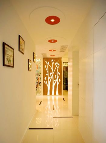 进入这条走廊,就好象置身在树林小路中,颇有一些童话色彩由于业主希望居室内有“树”的元素,所以设计师在客厅与餐厅之间走道的两个端头都设计了以树为造型的装饰墙面。一端是黄绿色底面白色树干,代表春天,另一端则是一颗木皮挖空的发光树,代表秋天。
