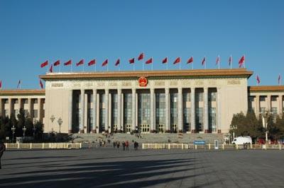 整组建筑平面呈“山”字形,正面墙呈“弓”字形。建筑面积达17.18万平方米。中部是著名的万人大会堂,会场呈扇形,共三层,可容纳10000人进行的大型会议。穹窿形的顶篷,纵横排列着500个灯孔,顶部为巨大的红五角星,周围是葵花环及三层水波形灯槽。北部为面积7000平方米的宴会厅,可供5000人的宴会和。南部是人大办公楼,包括以全国各个省、市、自治区、行政特区命名的各具地方特色的会议厅。