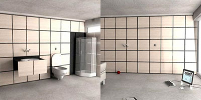 一面神奇的墙柜,它能瞬间变出淋浴房、洗手池、马桶和储物柜。最大程度的节省了空间,不过因为隐私问题,它可能只适合一到两人居住。