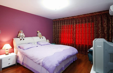 卧室设计,壁纸、紫色为主,相互协调性非常好,又能体现各种风格的不同特点,既丰富又统一。