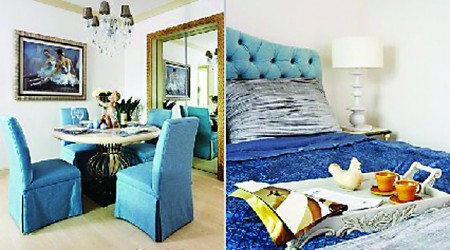 餐厅部分选取了一幅芭蕾舞者的油画,体现了主人的爱好,让生活中也充溢着舞蹈的美。卧室的床品选择了一套蓝绿色的。蓝绿色代表信任,代表有清晰的方向,有安全感。这也体现了主人自信、独立的个性,对自己充满信心,不迷失自我。餐桌、床头柜上的摆设也是精心挑选的。天使的花器寓意着主人内心的纯真浪漫,而小鸡、小鸟等摆设,又展现了她性情中天真未泯的那一面。