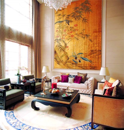 当代复古风潮的沙发居于空间正中,净白的软包透露着强烈的时尚气息,两侧搭配有东西方年代感的两组座椅。这三组座椅各居一方,中式榆木方茶几压在地毯编织的蓝色花鸟环中心,构成了稳重而沉静的起居空间。室外日光无声地透过落地窗纱,洒在巨幅淡雅的花鸟画上,呼应的是天花顶垂下的晶莹剔透的水晶吊灯,暗示着西洋皇室的华丽。
