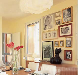 每一张照片都有一个故事。周末的时候,一家人围坐在餐桌旁,边吃饭边话说当年,合着窗外暖暖的阳光,其乐融融。几乎贴满墙壁的照片,没有什么规则地排列着,花瓶、餐具、桌椅等物品虽然很多,看似复杂,却在颜色与形式上统一成对美好岁月的回忆和感谢。