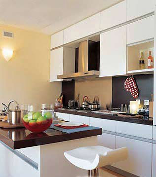 谁说年轻人不懂烹饪乐趣,不会品味美食?看这间厨房就知道主人的高超手段。但是如果没有与众不同的地方,是无法显示出青春活力的,它的特点就在于岛形工作台前那把孤独的高脚凳。白色橱柜、木质地面是对自身体力和勤劳的信心;多眼灶台、复杂的各类炊具体现了对美味的重视程度;高脚凳则让人在第一时间里尝到劳动成果。
