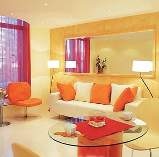 如果房间墙壁上有一块大镜子,镜子里就可以反映出全屋的景象,似乎有一种房屋扩大了的感觉,其实是这种光学幻觉在起作用。镜子可使你感觉到房间多了一扇窗似的,并能获得另一个光源。白色沙发、橙色椅子和靠垫、同色的墙与地面,在光与影、虚与实中回旋,安静、高贵却时刻闪现着青春的色彩。
