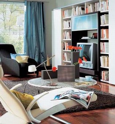 客厅的开放性决定了它的主题。在大气的客厅里融入一个充满知性的书房,“隐”才是关键词。选择与客厅风格、色彩都相适应的整体书架,大气恢宏的开放式书架,不但能容纳你所有的宝贝藏书,还兼当电视背景墙的角色。当然,书房也可以隐于客厅一角:一方透明茶几,做一个滑轮抽屉,将书隐藏与内,既可轻松拿取,又能营造出别样的书香气,会让每一位到访的客人洗去一身浮躁,一见倾心。