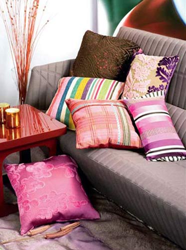 沙发靠垫虽小,但它的色彩、造型、图案和室内气氛相协调,点缀室内环境,活跃居室色彩气氛。夏季靠垫的色彩可选取冷色,冬季可选暖色;在一个长沙发上可放三种颜色不同的靠垫,如红、绿、蓝等,将靠垫放在沙发、凳椅上,不仅可调节座具的角度,而且可增加柔软度,使人感到舒服。总之,沙发靠垫作为家居装饰中的辅助品,可变性较强,可自己动手制作。