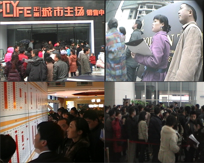 2009年11月28日,星期六的早晨,当很多人还在睡梦中的时候,位于成都市锦江区的牛沙路已经热闹起来。今天是这个叫做镏金岁月楼盘开盘的日子,上午不到8点,购房者就已经排起了长龙,浩浩荡荡的队伍一眼望不到边。而在签到处,不断地还有购房者赶来。