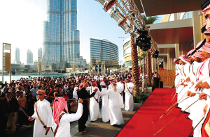 塔旁的迪拜喷泉以275米的破纪录水柱吸引世人目光。启用典礼整个过程由当地媒体作全球高清直播,有400多家全球媒体参与报道,全球20亿观众收看。