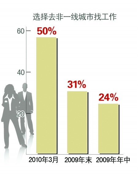 前程无忧组织的“今年三月,去不去一线城市工作”的网上投票中,有50%的人选择去非一线城市找工作,而这一比例在2009年年末为31%,2009年年中为24%。