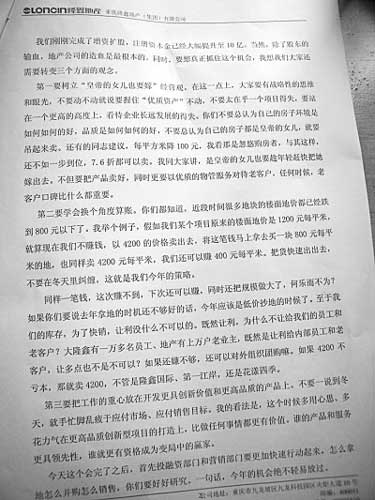 隆鑫地产一位不愿意透露姓名的高层领导向记者透露,其实这份讲话稿是删减后版本,这份整理后的讲话内容,主要是给隆鑫地产公司的经理以上、副总经理级别以下的人学习并领会精神,而只有几个核心层领导参与的内部会议,完整版里面降价的方案多达7种。