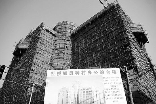 说它是热帖,准确地说其实就是一组照片。照片中,一幢大楼拔地而起,主体框架已搭建完毕,不过由于尚未完工,整幢大楼像是穿上了一层渔网服。大楼底下立着一块规划牌,最上面写着“杜桥镇良种村办公综合楼”,中间是大楼的效果图,9层高的大楼看上去颇为壮观。