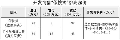 开发商获得的“假按揭”贷款,并非免费午餐。其主要成本包括:“买”身份证的费用、垫支的首付款、办房产证之前的月供。以40万元/套(100平方米)的住房为例,购房者首付20%(8万元),银行扣除10%抵押担保金后,将总房价的7成(28万元)——如果不包括其他打点费的话,转到开发商名下。
