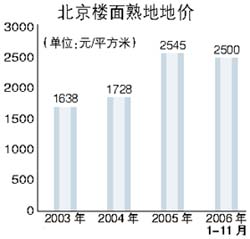 《蓝皮书》指出,2006年相对于2005年北京市的地价出现了下降趋势,2005年北京市平均楼面熟地价达到了2545元/平方米,而2006年前11个月的平均楼面熟地价只达到了2500元/平方米,预计去年全年将比2005年将有所降低。有关专家认为,这主要是由于去年成交的大地块全采用了招标的方式,一定程度上控制了天价地的出现。