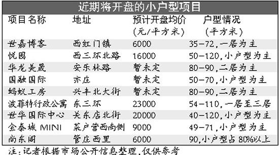 城建地产将于近期推出尚东阁项目,该项目90平方米以下的户型将占到80%以上。而北京万科企业有限公司有关人士则告诉记者,今年将推向市场的金阳公寓的所有住宅都将是小户型。