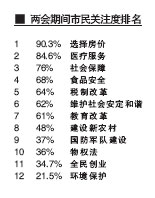 九成以上被访者两会期间最关注房价,其次是医疗服务、税制改革、社会保障及食品安全话题等。前日,中国社会调查所对外公布了有关“两会”的民意调查。