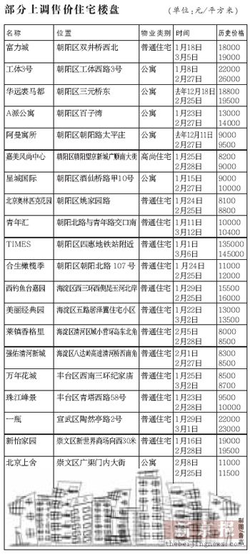 记者对40个典型热销楼盘进行统计发现,有30多个项目在春节后提高了销售价,一般在每平米100至500元之间,个别项目甚至上调了每平米近千元。如位于朝阳北路的青年汇项目,节前销售价为10000元/平米,3月12日该项目显示的销售均价则调整为10400元/平米;位于西南百万平米大盘万年花城,春节前销售价为8500元/平米,3月2日该项目销售价格上调至8700元/平米;位于双井桥的富力城春节前的销售价格为18000元/平米,3月5日该项目销售价格上升到19000元/平米。
