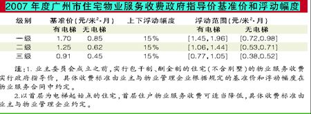 昨日,广州市物价局公布了2007年广州市住宅物业服务收费政府指导价基准价和浮动幅度,两项标准维持去年标准不变。而与以往不同的是,成立了业主委员会的小区物业费标准首次放开,业主委员会可以跟物业公司协商约定。
