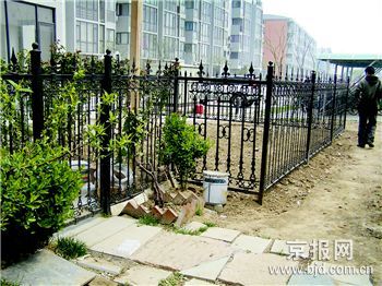 昨天下午,记者来到天赐良园小区,发现园内的“院景”真可谓是五花八门。在东三期2号楼东侧记者看到,一层一户业主家楼后的空地被一圈崭新的铁栅栏围住,而铁栅栏的“腰身”比楼身还“胖”出半米,因此被不少业主戏谑为本小区“最大的圈地运动”。而在东三期的21号和26号楼,不少底商也开了后门,并在原本栽种着黄杨矮木丛的绿地上翻建起自留地,种上大葱白菜。记者在小区内溜达了一圈,发现还有不少一层业主都在后院内搭起了架子,建起了凉棚。而同样的现象在一期和二期内也都不少见,记者在二期内看到,许多一层业主家的栅栏都将公共绿地栽种的树木囊入其中,还有几家业主搭建的爬藤架子从自家院内伸入公共绿地半米多远。甚至还有业主干脆将公共绿地上的小草踩在脚下,铺起两米长羊肠小道,方便自家人从后门出入。不仅如此,记者还发现仍有业主家后院呈现“增扩”痕迹,一户业主家就在原本的铁栅栏外又围了一圈木栅栏,以确保和邻居的“平衡”。