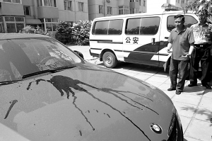 据了解,王女士的女儿星期天开车回家探望母亲,当晚,将红色宝马停在母亲家门前。第二天早上7点,王女士发现女儿车的风挡前黑乎乎的油漆连成一片,玻璃上贴着两张白纸,上面写着“别起刺,小心脑袋开花”。王女士当即报警。