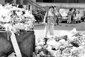 一位中年男子从10号楼走出来,左手拎着2个垃圾袋,右手捂着鼻子,在离垃圾车五六米远处,用力将垃圾袋一扔,转身便走。记者赶紧追上去,男子称,原来每天都有人早晚各一趟将垃圾运到垃圾站,可不知为什么,从8月17日开始,突然就没人给运垃圾了。紧挨着10号楼的9号楼旁同样形成了一个长约5米、宽约1米的垃圾堆。据该楼业主介绍,这儿原本有3个大垃圾桶,昨天早上全被保安卖给收废品的了,剩下成山的垃圾却无人问津。