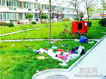 记者昨天上午11时赶到华龙苑北里小区,发现小区门口没有一个保安,任何人都可以随便进出小区。更意外的是小区里很少见到垃圾桶,草坪上随处可见居民乱扔的垃圾。