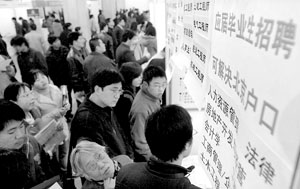 除了年轻人挤着递简历,甚至还有不少满头银发的老人在帮孩子咨询工作。负责招聘的工作人员嘴上、手上一分钟都没有空闲,一边回答问题,一边收着简历。有一家企业打出了应届毕业生给解决北京市户口的优惠条件,因此其“访问量”明显高于别的摊位。到房展开幕半个小时的时候,摊位上已经收集了近百份简历,而准备好的一叠“面试通知书”却一个都没向外发,用人的眼界显然很高,这个摊位的工作人员告诉记者,来他们公司应聘的应届毕业生至少也要是名牌大学毕业。