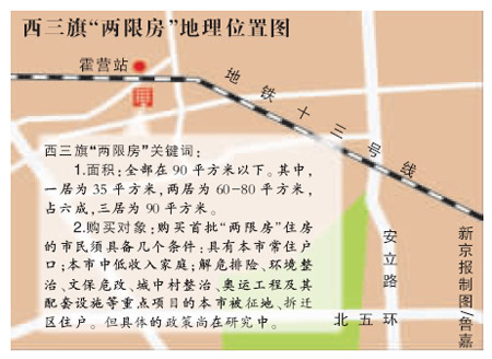 昨日(29日),备受关注的北京首块“两限房”用地——海淀区西三旗地块竞标揭晓,北京住总集团以13.98亿元中标。该集团昨日表示,将于今年11月对该地块正式建设,共提供4000多套住宅,预计2008年上半年开始销售,2009年底实现全部入住。