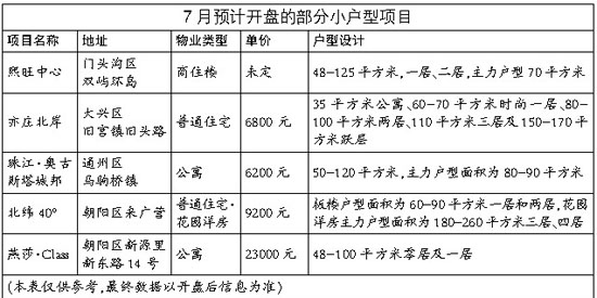 记者从市建委了解到的发放预售许可证情况,综合中大恒基不动产营销市场研究中心等机构的数据显示,7月预计有54个开盘项目,其中有多达18个小户型楼盘,其中10个为纯新项目,8个为老项目后期。