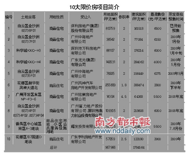 在这10宗限价房项目中,除了已经开售的保利西子湾以外,还有中海地产在金沙洲的金沙馨园和万科地产在开发区的新里程两个项目即将在今年1月开售。此外,和万科新里程项目邻近的广东龙光集团开发的限价房项目有望在今年5月份开售,该项目最高限价为4000元/平方米。其余限价房项目有望在今年下半年或年底前开售,而广东亨利房地产开发有限公司去年底在花都107国道附近拿下的限价地要到2009年才能建成销售。