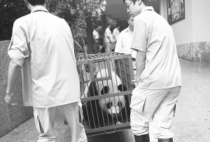 下午2时,运输车辆经过安检、消毒后,从上海野生动物园启程,3时到达上海动物园。在卧龙大熊猫保护研究中心的主管见证下,经过上海动物园和上海野生动物园共同检查,确认无误,完成动物交接。随后,工作人员开始为熊猫串笼。10只世博熊猫似乎知道要搬新“家”,乖乖地在饲养员诱导下,一个个按照指令很爽快地进入消毒过的笼“轿”内,安稳地等候上车。