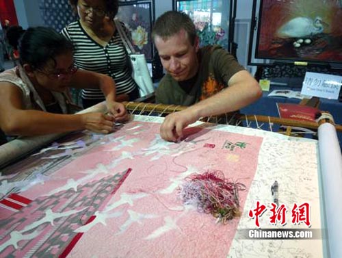 中新网上海7月20日电(肖前辉 刘吉科)入驻上海世博园宝钢大舞台“中国元素活动区”传习区表演半个月以来,湘绣以其神奇的针法和快乐的参与性受到世博游客的热捧。截至7月20日,已有来自世界各地的上千名观众参与了刺绣。