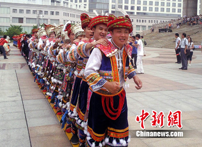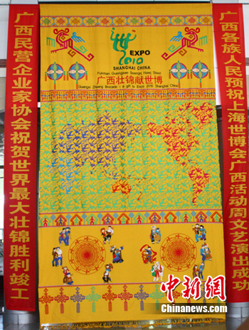 今天,由中国工艺织锦大师谭湘光和8名“织女”经过96天织就的世界最大壮锦,在“广西活动周”开幕式上赠献给上海世博会,壮锦长6.2米,宽3.6米。同时,“世界最长板鞋”亦亮相“广西活动周”,该板鞋共23节,每节2.2米,总长为50.6米,由115位身穿少数民族盛装的青年男女脚踏板鞋喊着号子向前行走。(完)
