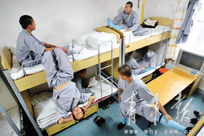 少林武僧团生活素描衣:青布长衣,青布长裤,手脚绷带,黄布鞋。食素食,牛奶和豆制品是最富营养的“补品”。住求职公寓,十人间,上下铺。行园区、宿舍,两点一线。 (记者 张春雷)