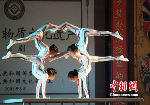 中新网盐城8月19日电 (于从文 唐铮)8月18日晚,江苏盐城水街漂城戏苑张灯结彩,锣鼓喧天,国家非物质文化遗产淮剧、杂技在此向参加世博会“盐城友谊日”活动的外宾献演,美轮美奂的表演博得外宾们的阵阵掌声。