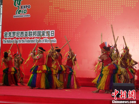 中新社上海8月29日电 (记者 郑莹莹)以热带风情著称的太平洋岛国密克罗尼西亚29日迎来国家馆日。在官方仪式上,数十名岛国舞者穿着及踝草裙,手持竹竿相互敲打,以原生态歌舞展现岛国热情奔放的民俗风情。