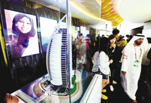 沿着时光隧道般的过道,古老的阿联酋慢慢展现在参观者眼前。阿联酋的大学生志愿者们穿着传统的服饰向游人问好,仿佛来自远古的驼铃声回荡在耳边。移步换景,在现代馆内,参观者恍如换了个世界,看到的是利用视听技术营造的现代阿联酋,它有着快速发展的城市环境,有让世界瞩目的建筑和风景,还有丰富多彩的时尚文化。