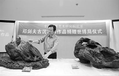 昨天(19日),全国根雕艺术研究院院长郑剑夫的古沉木雕作品捐赠仪式在世博局举行。上海世博局副局长丁浩向郑剑夫颁发了捐赠证书和中国馆纪念徽章。此次捐赠的《善缘》和《孔子》两件古沉木作品都是当代根雕艺术的精品,价值百万元,它们将在中国馆内永久性展示。