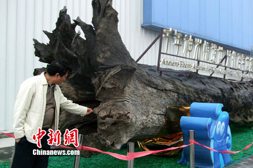 中新网上海10月25日电 (郑莹莹 达利敏)上海世博会联合国馆25日举办“千年神木 感恩世博”主题活动,一根长18.6米、重达22吨、外形酷似一条东方巨龙的千年古木亮相联合国馆外西侧的展示区,吸引游客驻足观看。