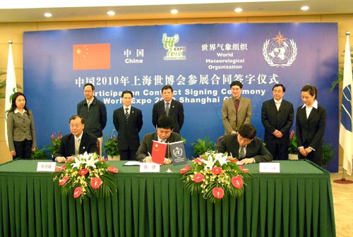 中新网5月9日电 据中国气象局网站消息,5月9日上午,世界气象组织展区总代表、中国气象局副局长许小峰代表世界气象组织与上海市政府副秘书长、上海世博会事务协调局局长洪浩签订了《中国2010年上海世博会参展合同》。这标志着首个国际组织正式签订了上海世博会参展合同。