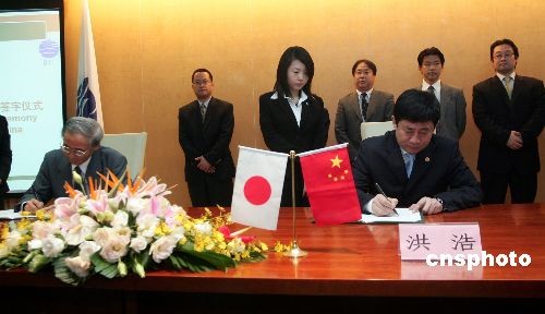 十月二十八日,日本政府与中国二0一0年上海世博会组织者在上海正式签署世博会参展合同,并公布日本馆设计方案。上海世博会日本展区总代表、日本国经济产业省顾问塚本弘(前左)与上海世博局局长洪浩签署合同。在世界博览会长达一百五十多年的历史上,日本曾先后五次举办不同类型的世博会,日本是国际展览局(BIE)的主要成员国。中新社发 徐洁晨 摄