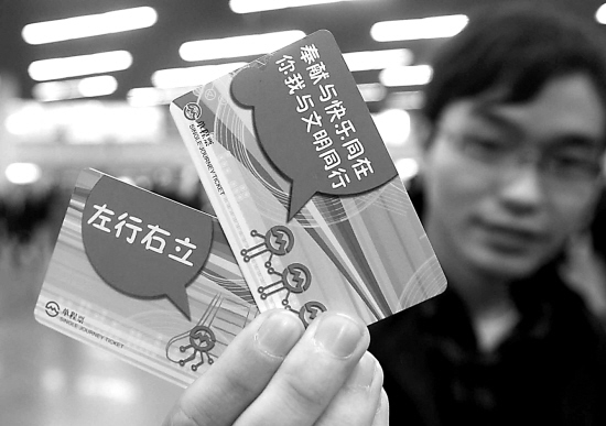 昨天,轨交部门制作的“文明乘车”宣传短片以半小时一次的间隔在各轨交车站和车厢的视频中播出;8万张专门设计、印有“文明乘车”卡通形象的地铁单程票,也同步在各站点开始发售流通。与此同时,轨道交通志愿者手持宣传举牌在人民广场站、世纪大道站等10个轨道交通枢纽车站的电梯旁、站台边,向广大乘客重点宣传“先下后上、左行右立、主动让座”的文明行为。 (朱正炎 朱岳方 陶健)